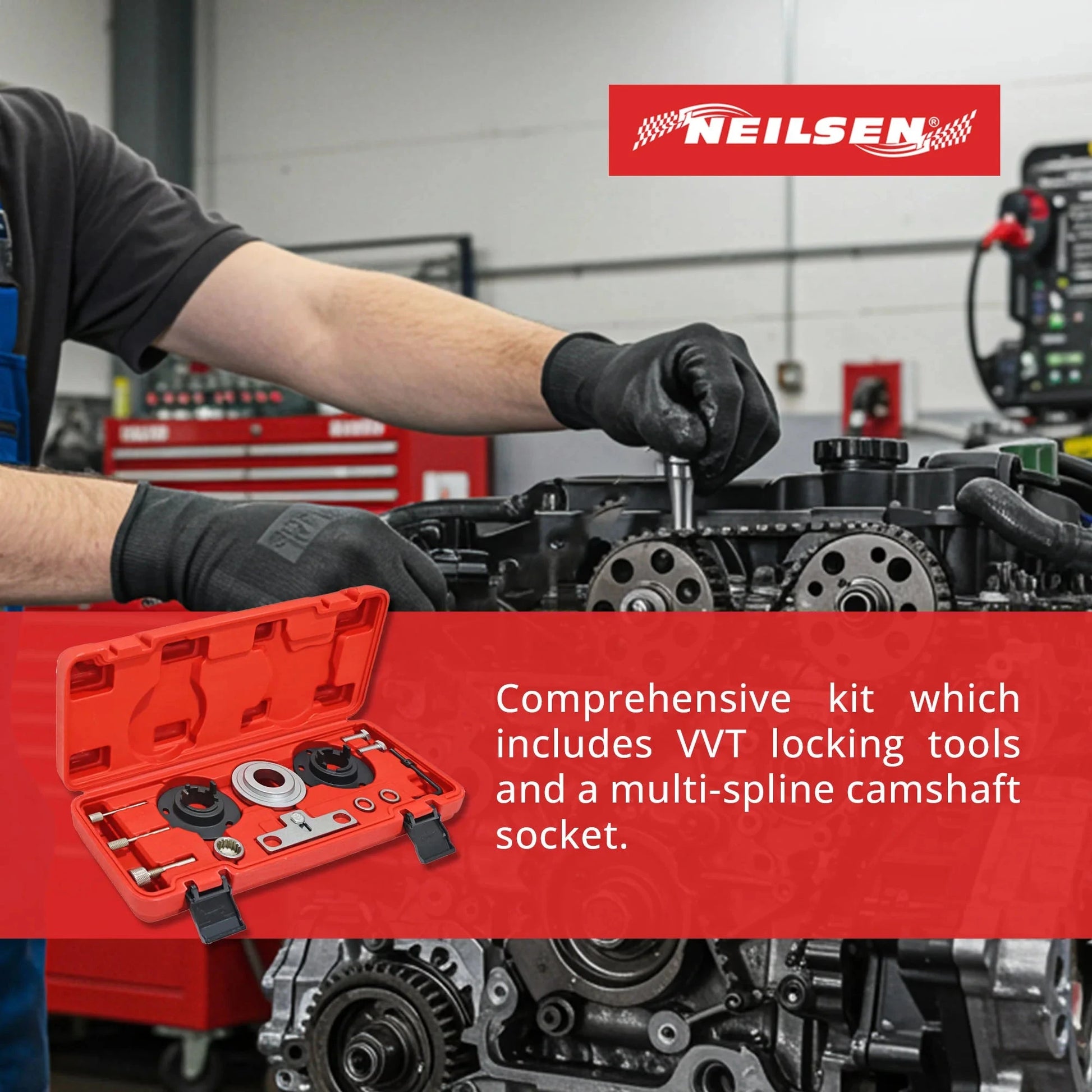 Comprehensive kit which includes VVT locking tools and a multi-spline camshaft socket.
